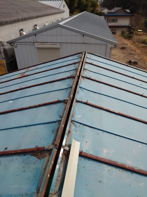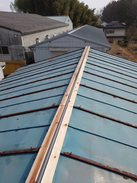 昔のプレハブの棟の交換をしました。付いていた板金も錆が入り下地の木材もボロボロになっていました。風が強いときの雨や雪は建物内部に入っていたと思われます。