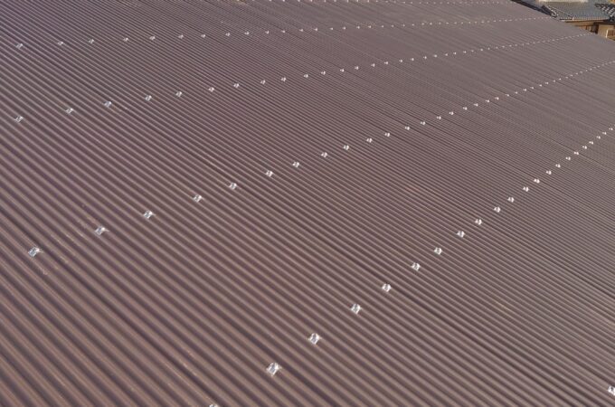 フレーム溶接 折板(せっぱん)屋根の施工中の写真です。倉庫や車庫、店舗などでよく使われる屋根です。